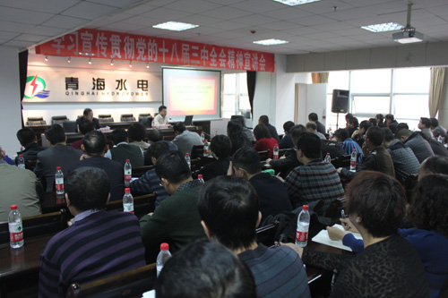 12月5日上午,青海水電集團召開學習宣傳貫徹黨的十八屆三中全會精神宣講會。省委講師團團長郭云甫同志作宣講報告。集團黨委書記、董事長唐增科同志主持宣講會,總經理王海青和集團班子其他成員李傳強、吳世周、徐強、李建民、姚鐵兵同志,各成員企業(yè)在寧的負責同志和黨群部門負責人、黨員代表,以及集團本部機關干部職工共70余人聆聽宣講。