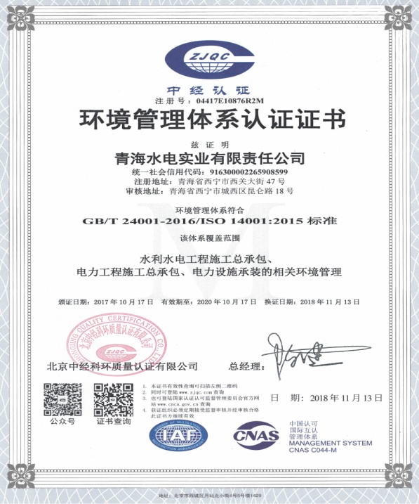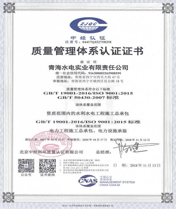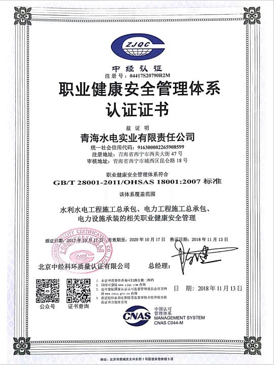 1119日水電實業公司順利通過質量、環境、職業健康安全管理三體系認證年度監督審核,并取得擴項后的認證證書。